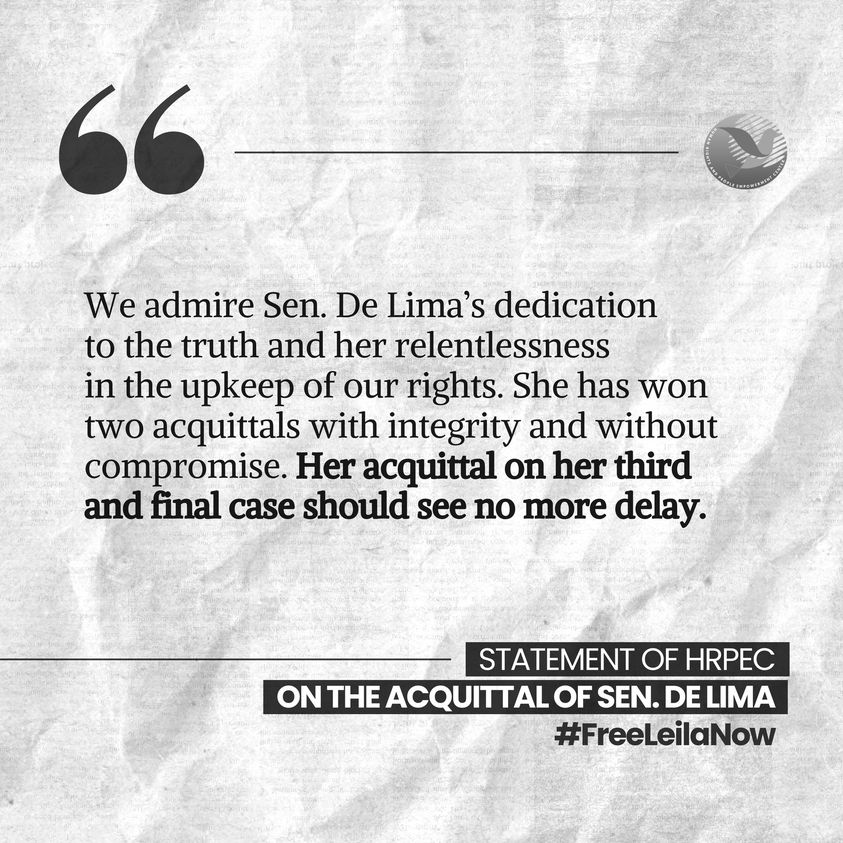 The Human Rights and People Empowerment Center welcomes and applauds the court’s acquittal of Sen. Leila de Lima.